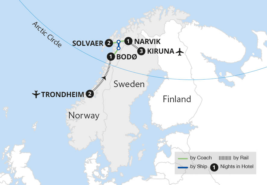 Beautifully scenic Scandinavian rail journeys take us from the ancient Viking capital of Trondheim to wintry Kiruna in Swedish Lapland, enjoying many opportunities to be dazzled by the ethereal Northern Lights. Travelling through amazing landscapes by rail, cross to the Arctic Circle to Bodø. From here, seek the ethereal Northern Lights on the...
