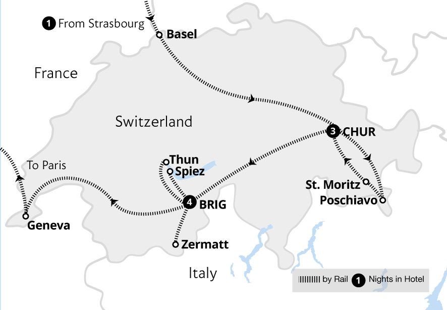 Staggering mountain peaks and serene alpine lakes provide the extraordinary setting for this holiday as we travel in First Class all the way, including on the iconic Bernina Express and Glacier Express. Staying in the Engadine Valley and the popular mountain resort of Zermatt provides idyllic bases from which to explore the Swiss Alps by rail...